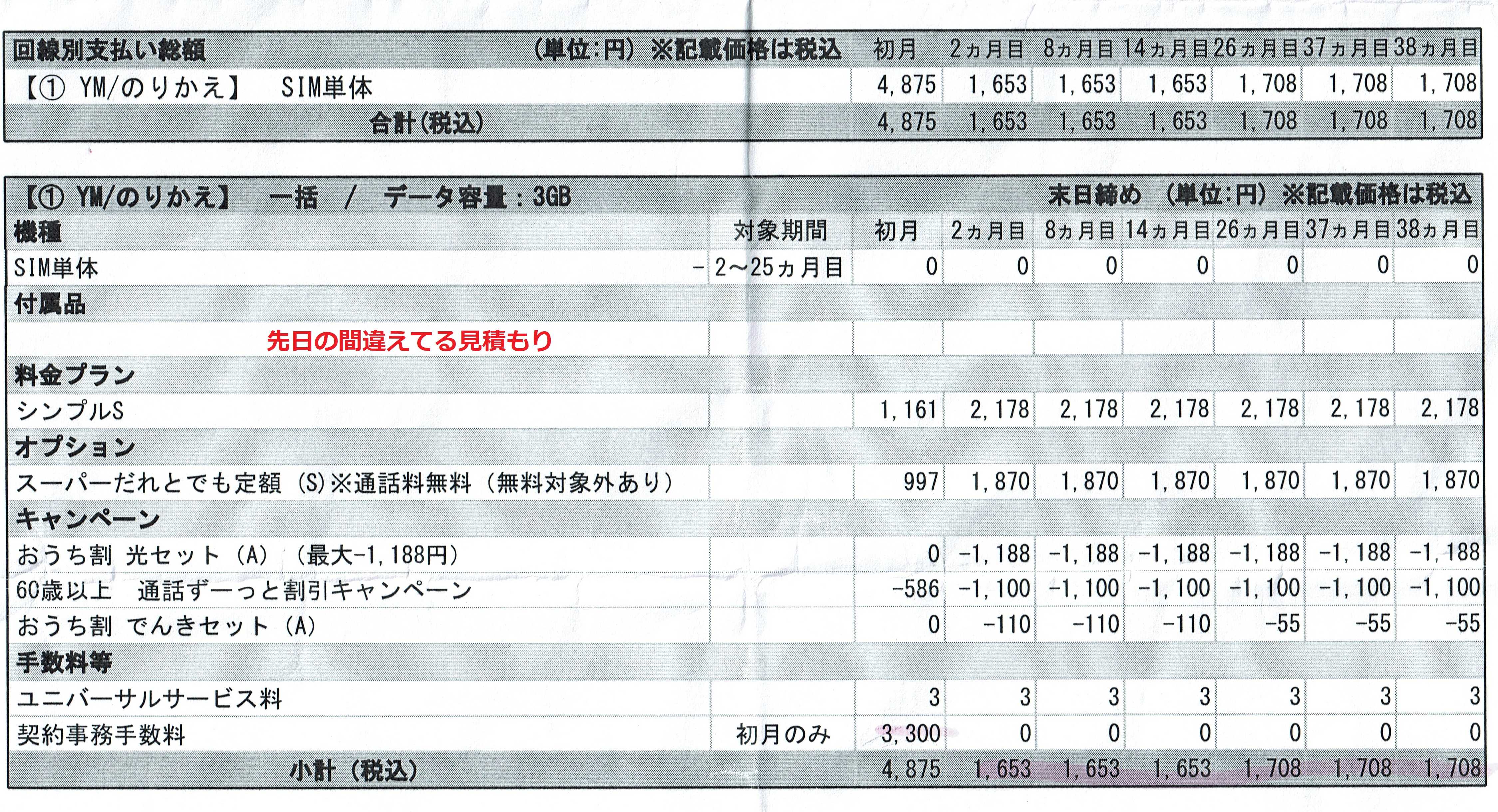 奥さんのスマホはSBで1Gでも高いこれをY!mobileの3Gに変更するなんと繰り越しがある5分間の通話無料が無制限となる毎月3200円ぐらいだったかな? それが1600円ぐらいになったしかも前回の契約、そして先日の見積もりでも割引が少ないことが判明したベテランのS嬢が気が付いてくれて予想よりも更に少し安くなったやっぱり新米さんは少し間違えてしまうのは仕方ないか大きかったのは事務契約手数料だ無料になったのは先日の見積もりでは3000円おうち割電気セットが我が家は2契約なので110円の割引がひとつしかついてなかったのだがこれは本来は2契約なのでお互いの割引があるので220円の割引をするべきでしたとうっひゃ~、S嬢、ありがとう~コンビニ珈琲1杯分毎月お得~なんやかんやと1時間以上の時間がかかったけどオイラにはあっという間のことだったY!mobileさんに(SBか)感謝だ間違った見積もりと契約した明細を並べておこう