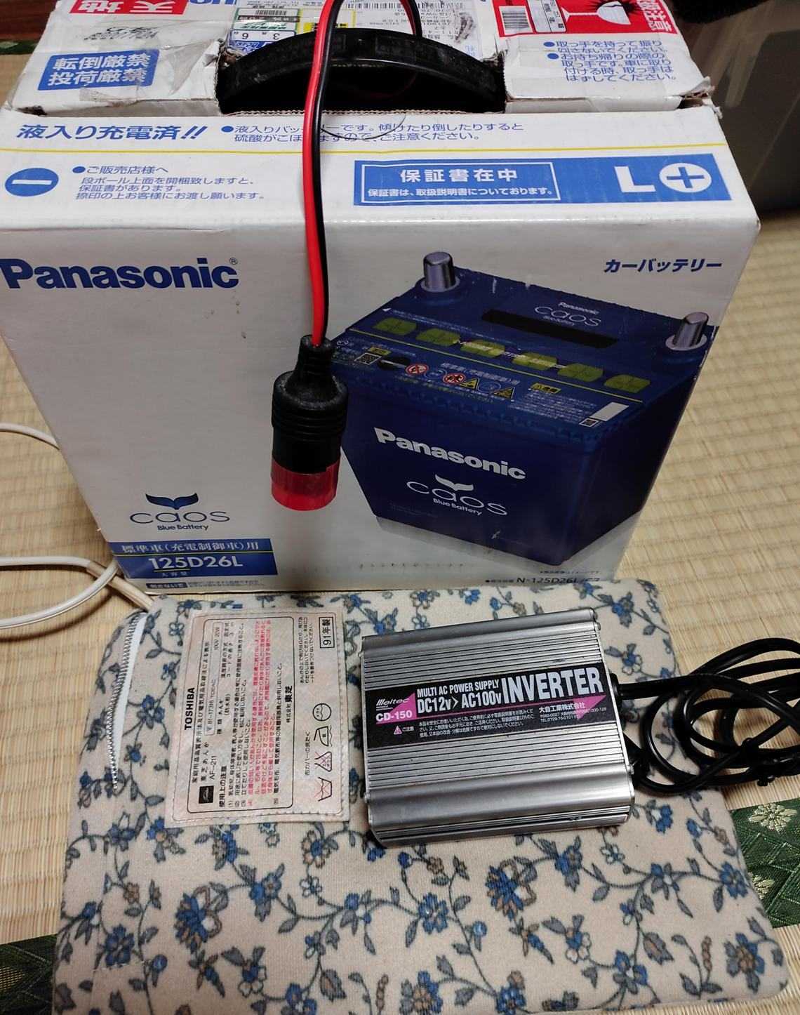 貰い物の150Wのインバーターに古い電気あんかで寒い冬の車中泊は使えるかしら?試してみた予備の予備で室内に保管してあるバッテリーこいつは長めの寒いときの放浪には同じバッテリーを並列使っている走行発電させて走るから翌日にはそこそこ補填されいてるから2週間ぐらいはどおってことなかったドラレコも24時間録画しっぱなしでも無問題150wの矩形波でも一晩大丈夫か実験しておくと本番も安心だ電圧は12.6Vでスタート、翌朝までホカホカだった暑いくらいで離して寝たぐらい12.4Vに下がってたまったく問題なしだこれは使えるぞNBOX+カスタムに積みっぱなしの30Wのインバーターだとどうなんだろう?30Wに対して20Wのあんかはギリかなこれが使えたらもっと余裕だな