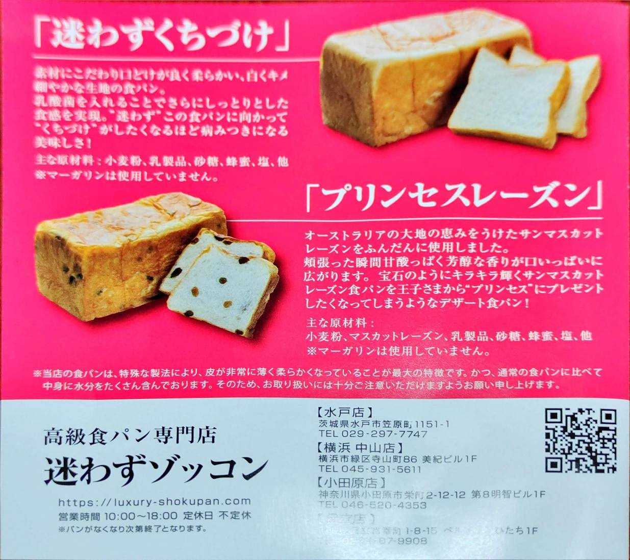 親戚から小田原に出店しているパンをいただいたどこ?迷わずゾッコン 小田原店 だこれは食べてみたいと思ってたパンだ香りがいいねぇ夕食後にいただいた歯磨きしたあとだったけど、また磨けばいいやってちょっとだけ食べてみたう~ん、甘みのあるパンだ香りもいい高級なパンてぇのはこういうものなのかと納得した