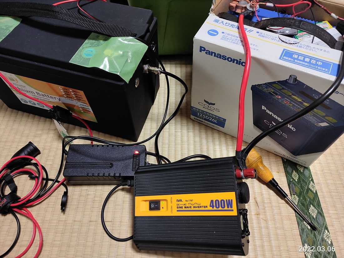 車中泊で電気使うのは冬の電気毛布ぐらいかしらなのに電気を欲しがる変人だ前から試してみたかったのにやらずじまいだった実験をしてみた100Aのリン酸鉄バッテリーは昨夜ずっと12Vの電気毛布を使って少し放電させておいたこれを125のバッテリーから400Wのインバーター使って100Vを作って100Aのリン酸鉄バッテリーの充電器を動かして充電できるかを試してみた結果は上々、ちゃんと充電してくれた初めてインバーターのファンが回転した以前、このインバーターで100Vの電気あんかを使ったら消費電力が少なかったのでファンは回らなかった一晩使っても熱も持たなかったさすがに今回はファンは回るし少し熱ももった実際には125のバッテリーは2個並列で使うのでパワフルなので125のバッテリーがヘタることは少ないと思う弱ったところで走行充電器で13.0Vぐらいまで復活するしでもって更には強力なポタ電もあるし電気あまり使わない車中泊してるのにどこへ向かおうとしてるのだろう