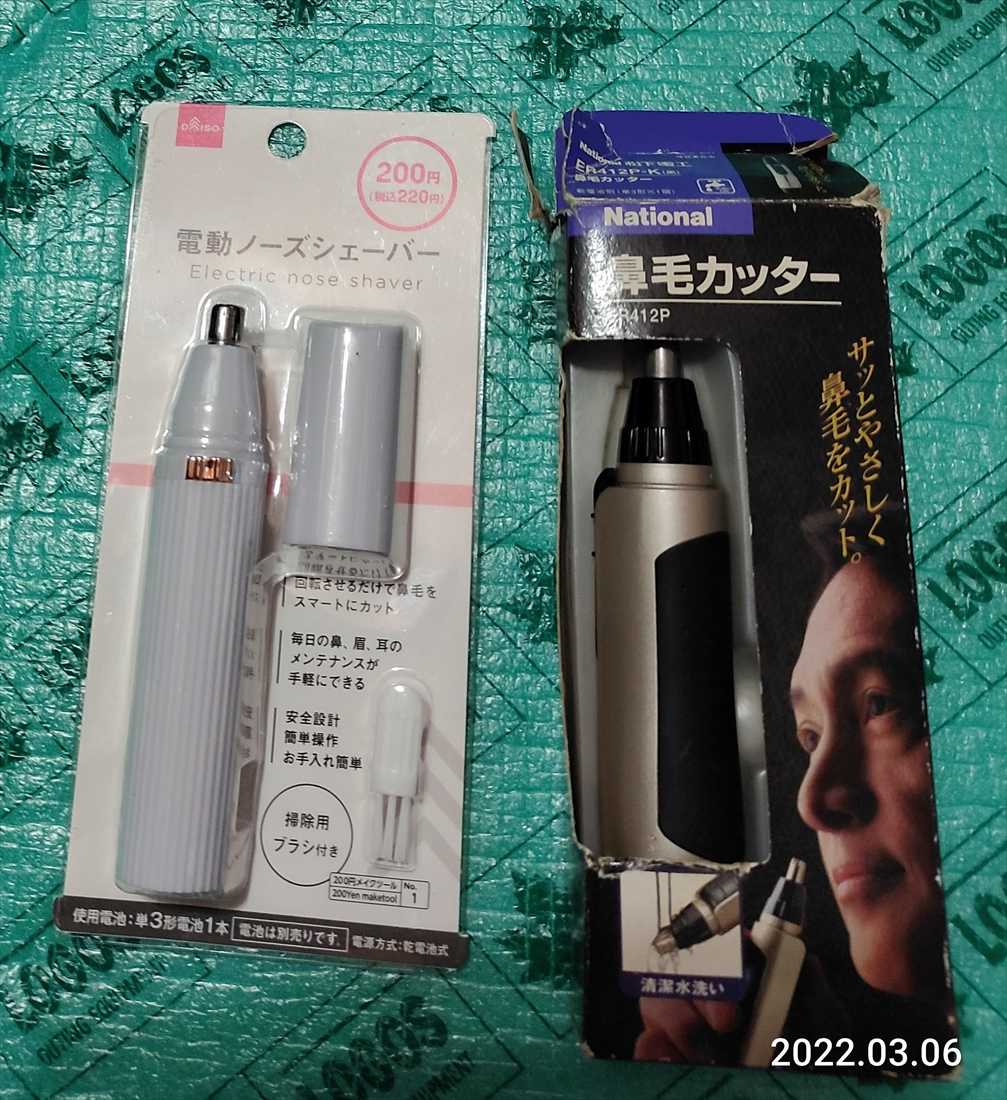 パナの鼻毛カッターを長年使ってた1回しか替え刃交換してなかったので切れ味が落ちてきてたけどマイッカで使ってたのだがとうとう動かなくなった新品の電池入れて手で回転させても動かないモーターが錆びついたたのかな?またパナの製品を買おうと思いつつ先日ダイソーに立ち寄ったら200円で売ってた200円なんて嘘みたいアルミシートを買うついでに面白そうなので買ってきたこれでパナはお役御免だよく頑張ってくれたよ作りはチャチイそりゃあ200円だものしかし使ってみたらビックリパナとまったく変わらないまぁ、これってやってることはみな同じなので変わり映えしないのだしかし200円でこの性能はCP高いなベリー👍だな