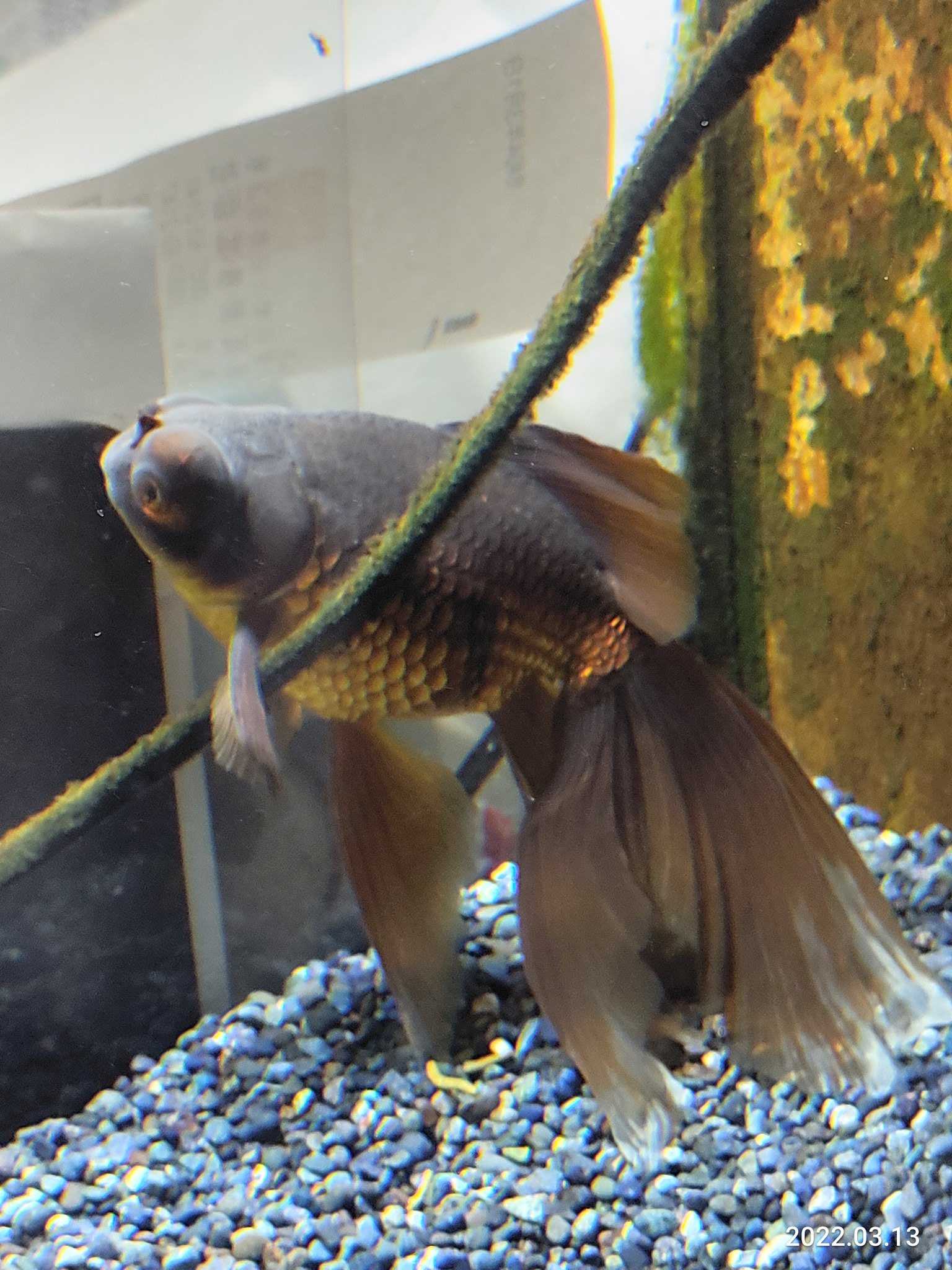 我が家のデメちゃんは今までは浮かないようにケーブルに頭を入れて固定して寝てたしかし最近は沈んでしまうらしくケーブルにヒレをひっかけて沈まなくして固定している無意識のときに水流で流されないようにしているのだろうなかなか賢い