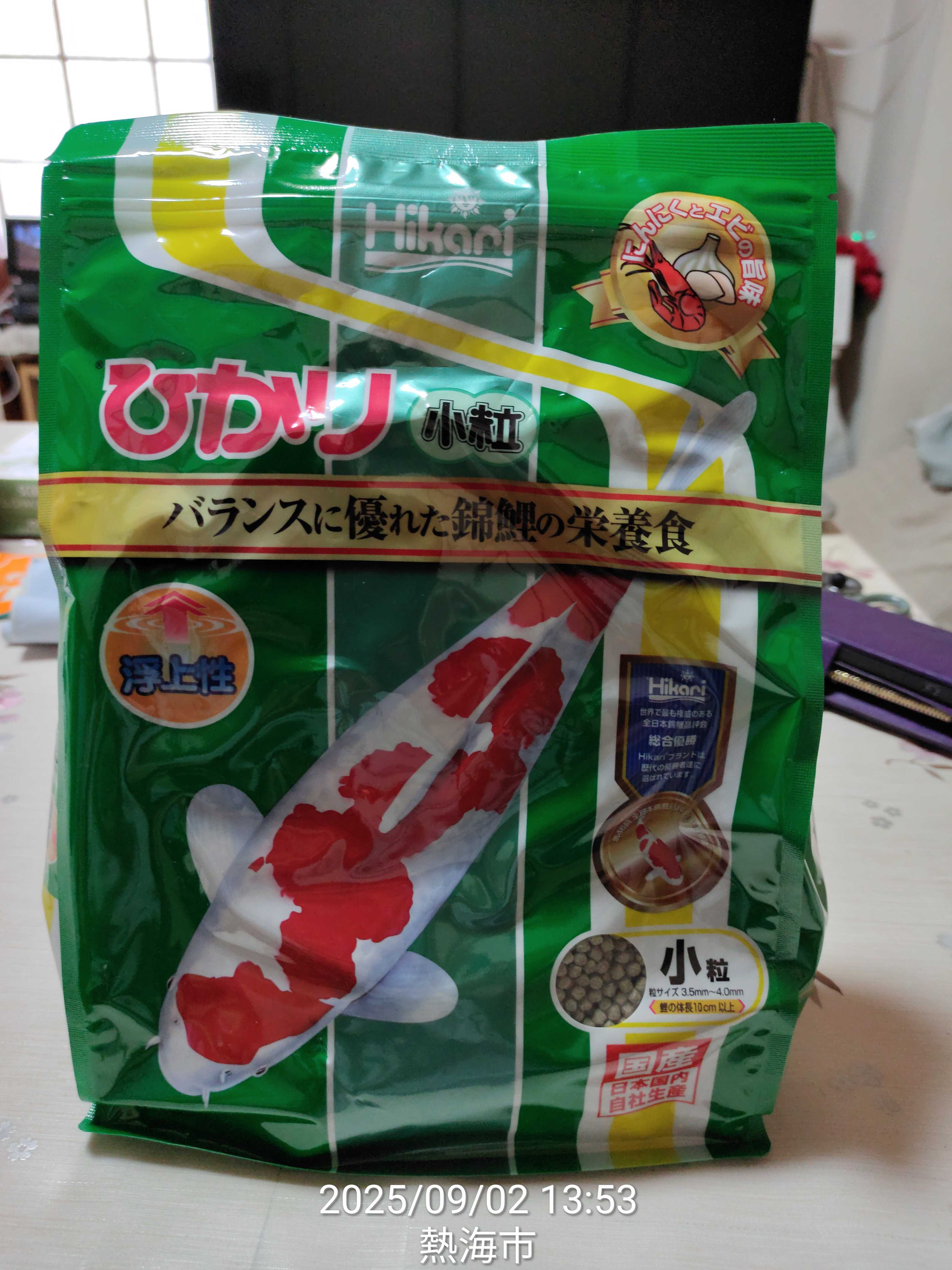 いつもは極小粒だけど、、、小粒にした玄関の金魚はこのサイズでも無問題浮上性もOKメダカには粉砕する機械で細かくできるからこれでいいのだ