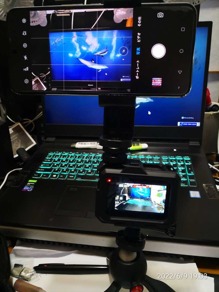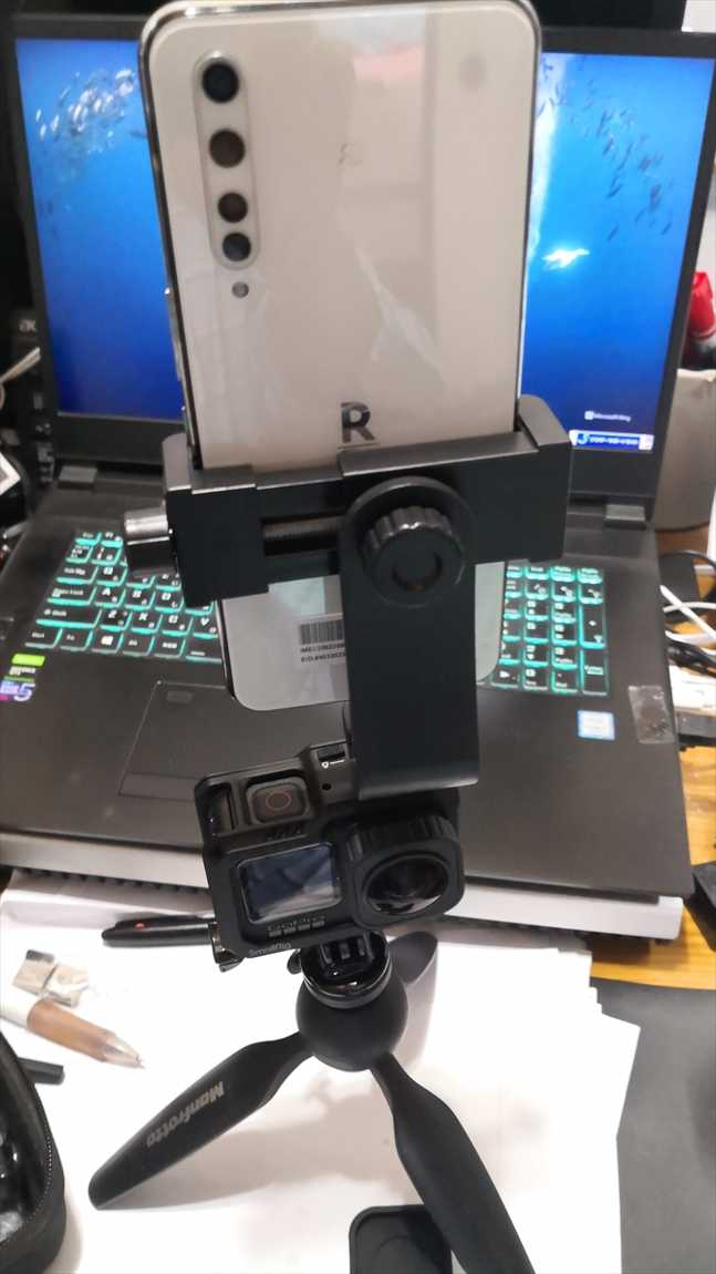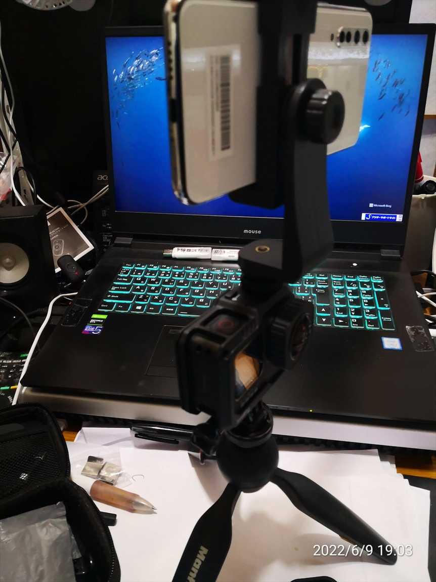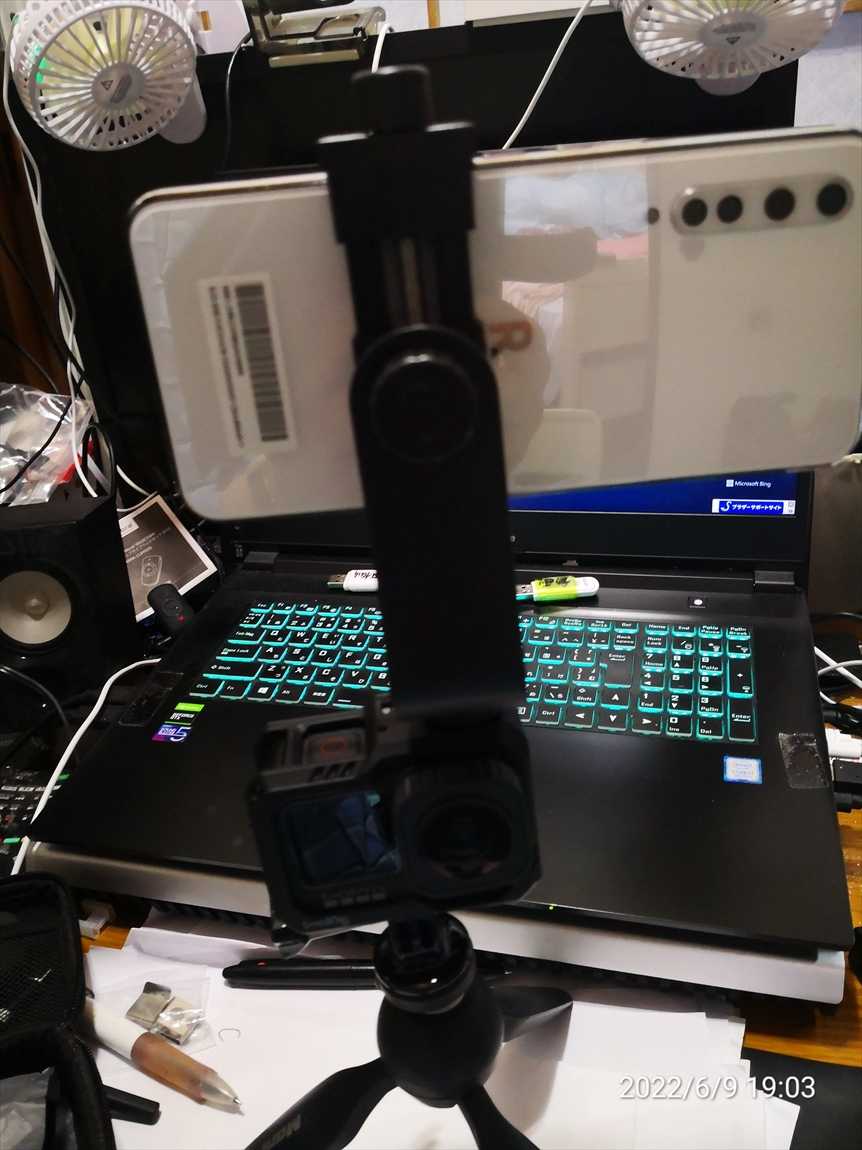 今までは水平のバーに横並びでGoPro HERO9 BLACKとスマホを三脚に付けてた