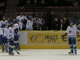 ハルラの選手はベンチに引き上げる・・・1P2P3P計KOKUDO1225ANYANG HALLA0011えーっとですね、オフィシャルには↑コレでもホントは1P2P3P計KOKUDO1124ANYANG HALLA0112です!結局、仕事をちゃんと終えてから東伏見に行ったので(←当たり前だ^^;)着いたら2P途中。1-0でコクドリード。プレーオフらしい締まったいい試合だった。ところが2P終盤、それは起こった。ハルラの選手が放ったシュートがコクドゴールへ吸い込まれる。「うわーっ、やられた!」これで2-1。やっぱり簡単には勝たせてくれねーか・・・と、思ったらプレーがまだ続いてる。それどころかカウンターの形で今がゴールを決め3-0になった。「?」なんだかよくわからないが、ネドベドのアピールを見ていると、ゴールネットに穴が開いていて、そこをパックが抜けて行ったのでノーゴールと判断されたということのようだ。後ろで見てるゴールジャッジって、プレーが停まったときに「パックがゴール内にあるかどうか」だけで判断してんの?しかも、近くにいた客のヤジを聞いてると今日2度目らしい。ハルラは選手をベンチに引き上げさせ、審判がフェイスオフを促しても氷上にはコクドの選手のみ。コクドファンからも審判に対しヤジが飛ぶ異様な状況になった。このまま没収試合か?それともハルラの試合放棄か?そんな状況が20分ほど続いた後両チームの選手が引き上げ、2P19分4秒で整氷が始まる。その後、2P19分4秒から試合再開。2Pと3Pの間に休憩ナシというおかしな方式で続きが行われたが、やけに汚いプレーや乱闘が多いイヤな試合になった。WBCに続く世紀の大誤審で後味の悪い勝ち方になったが、アレが正しくジャッジされていても4-2で勝っていたというのがコクドファンとしてはせめてもの救いだ。(3Pは明らかにハルラがやる気がなかったが、それを言い出したらきりがない)ともかく次はいよいよ釧路! あと3つだ!