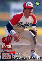 きのうの日記のコメント欄で書いた「憲史のルーキーカード」です表興味深いのは、やっぱり「INF」の文字。さらに当時は名前の読みが「KENJI」。裏書いてある解説「The Rookie Story ドラフト指名4位。リストを生かした打撃はパワフルそのもので、1年からレギュラーで高校通算48ホーマーのスラッガー。外野手だが、どこでもこなせる器用な万能選手でもある。50mを6秒2の俊足の上にスイッチヒッターとは、将来の近鉄核弾頭の候補者である。Did you know? 近鉄には川口のよいお手本がいる。大島選手で、94年は一塁を除く内野全ポジションを守っていた。打ってもスイッチヒッターで、93年に入団すると早くも91試合に出場して.280。この大島も92年のドラフトでは、下位の5位で指名されたのまで似ている」何度読んでも「誰のこと書いてるんだ?」だ^^;高校時代に外野手だったのを近鉄は内野手として獲ったってことかな?それにしても「お手本」が大島って・・・ずいぶん方向性の違う選手になっちゃったなぁ。ま、たまには「憲史応援サイト」らしいことを。ってことで^^