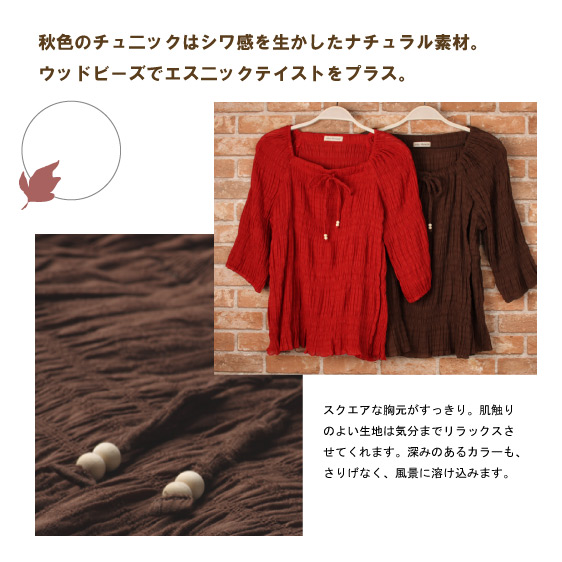 これからの季節、すぐに活躍しそうな8分袖のチュニック。ガーゼのようにやさしい肌ざわりがたまりません!スクエアネックに、木の実のようなウッドビーズがアクセント。しわ感がすっきりシルエットを演出してくれます。 紅葉のように鮮やかなブリックとしっとりした木肌を思わせるコーヒーの2色。サイズもMとL展開と嬉しい限り。ぜひぜひチェックくださいね