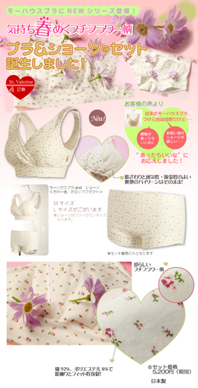あの「モーブラ」に、柄ブラが登場!しかも、初のショーツとセットということで、週末の発売以来、たくさんのご注文をいただいています!プリントは、シンプルな小花柄。ショーツも、モーブラテイストの「冷やさない」けれども「すっきり」タイプ。気持ちよ~く着られます。限定数での生産となりますので、どうぞお早めに!