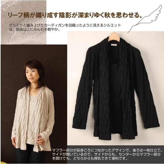 主宰光畑もお気に入りのペアリーフ大人なシルエット、だけどどこかしらあどけない、かわいらしさのあるアイテム。一枚でたっぷり使えそう。首のラインも隠せるので、日焼け対策にも、冷えによる肩こり対策にももってこい。ブラックとベージュの2色。光畑は講演の時にブラックをよく着用していますよ