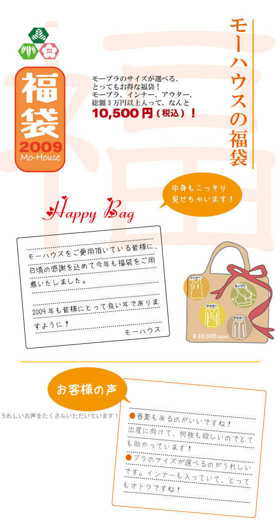 新春のお喜びを申し上げます今年も、授乳服の製作・販売やイベントを通して、母乳育児を応援してまいります。本年もどうぞよろしくお願いいたします。さて、今年も新春恒例の福袋販売しています。秋冬物だけでなく、春夏の福袋があるのはネットだけ。今年春夏にお産を控えているプレママの皆さん!ブラのサイズも選べる福袋、ぜひゲットしてくださいね。