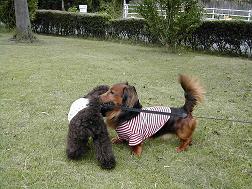 モコが家に来てから早2ヶ月半座れ・伏せ・お手etc...さすがトイプードル、直ぐに覚えてくれたの~^^しか~し、ワンコを見るといつでもどこでも遊びたくなってしまうのです・・・モコママはdog cafeでおりこうにしているモコが理想なのに現実はキビスィ~~こんなモコですが、どうぞよろしくお願いします(=´ー`)ノカフェリリオの看板犬チョコくんと遊ぶモコ