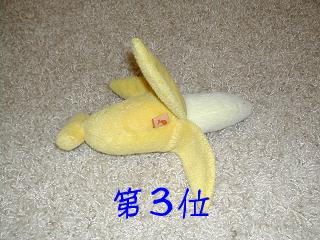 僕が気に入っているおもちゃだワン!第3位は皮のところがカサカサいうよ。振り回して遊んでいると、ときどきバナナが飛んでいくんだ。おもしろいよ♪第2位は野球は全然分からないけど、これをかじると興奮して「うぅ~、うぅ~」言っちゃうんだ。そして、第1位はぶたのベイブ君!!夜になるとベイブ君をくわえて誰か遊んでくれる人を探すんだ。そして、遠くへ投げてもらって取りに行って遊ぶんだよ♪みんなのお気に入りのおもちゃを教えてね。