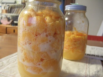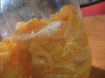 室内4日目朝。みかんCOBOくん達の水分はかなり増えてきたけれど酵母が活発に働いている!とは言い難い雰囲気。。しかも2本仕込んだうちの1本は、もしかしたらダメかも。。昼間でかけて夕方帰ってきたら、みかんCOBO2に泡を確認!みかんCOBO1はやっぱり。。。同じように仕込んだつもりだけどまあ、初めてなんだから失敗も仕方がない。で、夕食を食べた後にみかんCOBO2にも発生してきた黒っぽいものが付いたみかんを取ろうと瓶のふたを開けたら「プシュー」と炭酸飲料の栓を抜いたように瓶の口元まで噴きあがってきた。なんか、いい感じじゃないですか!みかんCOBO1もふたを開けたらこちらも「プシュー」と噴きあがってきて半分諦めかけていたけど大丈夫みたい♪いよいよ明日、みかんCOBO2でパンを焼こうと思います。みかんCOBO1はもう少しおいてスープにしようと期待は膨らむのでした。