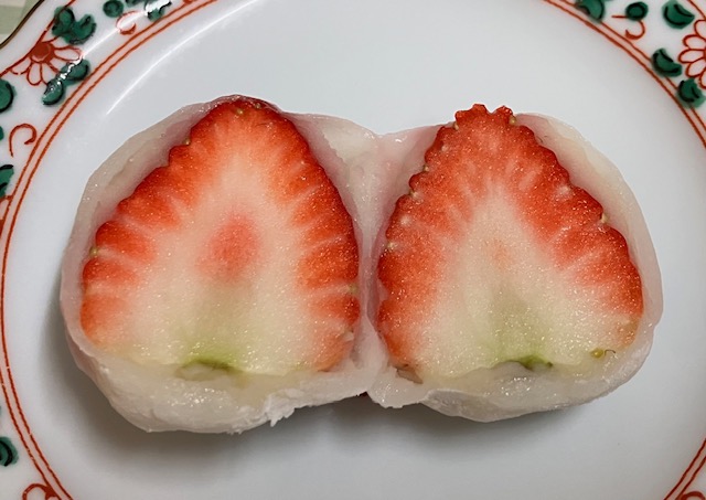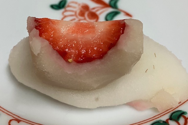 薄い求肥に白あん。苺餅(いちご大福)は市内ではここのが一番と思ってる。