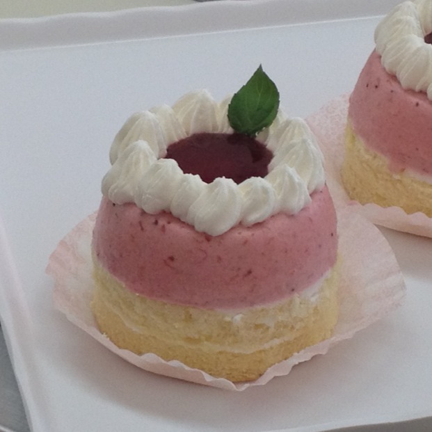 苺のピューレをたくさん使い酸味の爽やかなババロアに苺ソースをのせた苺たっぷりのケーキです。(o^^o)
