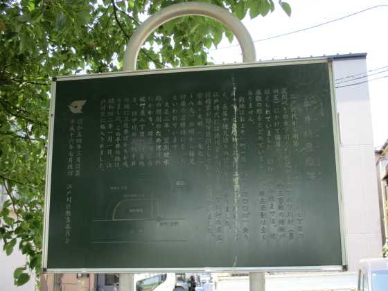 大正2年、荒川放水路の開削のため河川敷にかかり、旧墨田区吾嬬町東8丁目64番地と、旧中川の南側平井の地に3反歩ばかりが残りました。この平井の地は、昭和42年1月1日、江戸川区に編入されました。