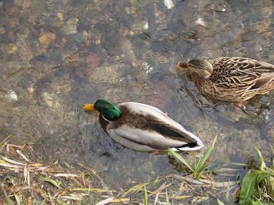 京都の白川で仲良くエサを探す鴨のつがい?この白川にそって行く先に平安神宮の大きな鳥居が見えてくる。