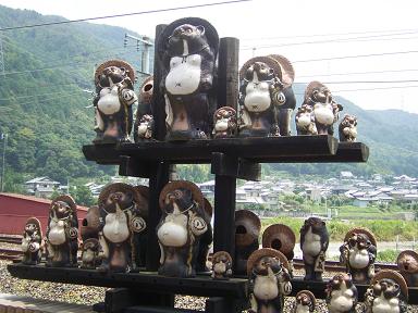 あつい暑い日に、嵯峨野のトロッコ列車に乗ってきました。 京都からJR嵯峨野線に乗り換え、馬堀駅下車徒歩十分 トロッコ亀岡駅では かわいい狸さん達のお出迎え このあたりは流れも緩やか のどかな感じ 保津川の流れもだんだんと早くなっているようです。