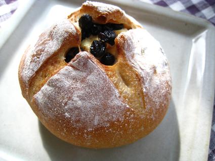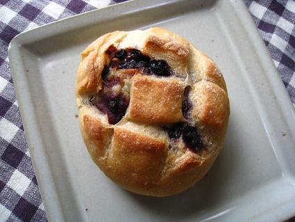 年末に焼いたパンがもう1種類元気のない柑橘系酵母に小さじ1/16程度のイーストの助けを借りて焼いたパンです。さつま芋+ブルーベリーとってもマットな焼あがりツヤ感ゼロどこにさつま芋?? と思われるかもしれませんが、生地に練りこみ&ブルベリーの下に芋餡にして入れたんです!私の記憶違いじゃありません!!確かに入れたんです!!!まったく存在感ありませんがお味もいまひとつパッとしない残念な結果になりました