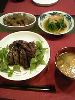 久しぶりにちょっと足を伸ばして、府中の市場に行きました。鮮魚店で鮭の半身(1250円)を購入。すると目の前に、「くじら肉1050円」と書いて、マグロの血合いのように真っ赤な切り身がパックに入って売っています。本日のお薦め品なのか、パックは沢山あります。小学校の給食で食べた記憶はありますが、最近は見ることすらありません。なので、当然、息子もくじら肉を食べたことは無いはず。話の種に、挑戦してみるかぁ~o(^-^)oと、面白い物好きの虫がうずき、1パック購入。家に帰って、まじまじと見ると、ホント真っ赤!ちょっとグロテスクかも~(*_*)と、ここに来て、買ってしまった事にやや後悔(-.-;)。でも、ネットで調べたら調理法や、鉄分が豊富でヘルシーとの記載も有り、気を取り直して調理開始。不安だったので、半量のみ使い、本日の夕食に「くじらの竜田揚げ」↓。元の色が濃いので、揚げた色はチョコレートケーキの様。「すごいね、初めて食べるね。」「きっと調査捕鯨でとったくじらだねー。」と会話は盛り上がり、「頂きま~す!」ガプリ。息子の感想・・・「まぁまぁだね。」アハハf^_^;、私の腕不足でしょう、確かに「まぁまぁ」でした(苦笑)。あと半量残っています。どなたか、くじらの赤身の美味しい調理法ご存知でしたら、教えて下さいm(__)m。