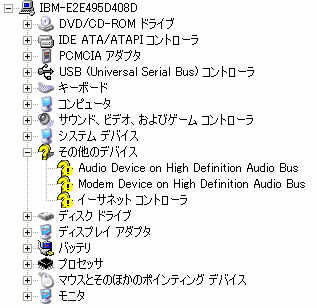 R61で動作しているXPのHDDをR61eに換装した。このR61eは、CPUがCeleron 540、ChipsetはIntel GL960 Express。動作させてみると、「Audio Device on High Definition Audio Bus」「Modem Device on High Definition Audio Bus」「イーサネット コントローラ」の三つが「その他のデバイス」となり、正しく認識されなかった。ChipsetもR61とR61eで違い(「Intel GM965 Express」と「Intel GL960 Express」)があるが、互換品のようで、デバイス的には何の問題もないようだ。また、ビデオドライバも同じようで何も問題が起こらなかった。(チップセットな移動の「Intel GMA X3100」)ドライバは、LenovoのサイトよりDL。「Conexant オーディオ・ドライバー(Windows Vista/XP)」「Broadcom NetXtreme/NetLink ファスト/ギガビットイーサネットソフトウェア」を使用した。(モデムは使わないので省略)デバイスマネージャーで確かめてみると、「Conexant High Definition Audio-Venice 5045」「Broadcom NetLink(TM)Gigabit Ethernet」がインストールされていた。つまり、R61とR61eで、サウンドチップ・イーサネットチップが異なるということだろう。