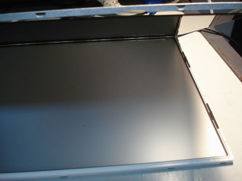 今回は液晶のスチールフレームを外して、導光板と偏光板、液晶ガラスの間を確認。偏光板と液晶ガラスの間に水でも入ったのだろうか。偏光板が液体で濡れていた。これはティッシュでやさしく拭き取る。しかし、液晶ガラス表面に貼られたシートに空気が入ったのか波打った状態で、こちらは拭いたぐらいでは解消できない。(ガラスに入った気泡を、プロはどうやって抜くのだろうか…。)