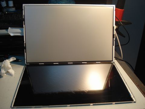 ※開腹したT410液晶。偏光板の表面が濡れている状態だった。