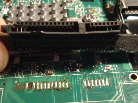 とりあえず、このHDDコネクタを外してみることにしたが、ピンがコネクタの奥の方なので、ヒートガンで炙るのは難しいと考え、半田ごてで温めて取り外すことにしたのだが…。