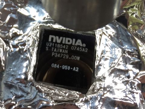 ※GPUのコアまわりをアルミホイルでマスキングして、ヒートガンで40秒ほど炙る。
