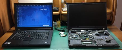 ※スペアのT61p(左)でメインのHDDを起動。問題のT61pは分解。