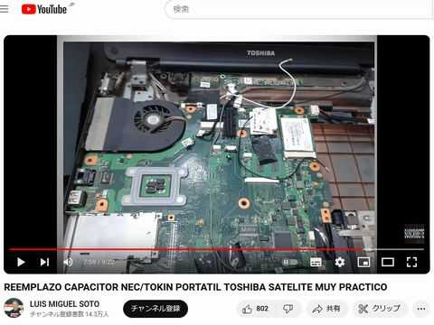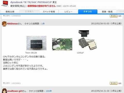 購入してから半年ぐらい前までは何も問題なくつかえていましたが時々シャットダウンするようになり最近ではACアダプターを挿すとすぐにシャッとダウンしてしまうようになり、東芝に修理をだしましたがトータルで4万6千円ぐらいかかると言われので返却してもらいました。運賃を4200円取られました。長期保証に入っていなかったので無料保証になりませんでした。しかしこのコンデンサの不良が原因ならばボード交換しても再発するかも?