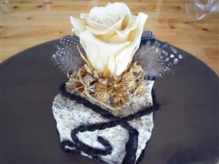 今月のお花のレッスンに行ってきました。夏の間は生花があまり持たないので、今回はプリザーブドフラワーを使ったアレンジでした。 花材は プリザーブドフラワー(シャンパン)・ほろほろ鳥の羽・棕櫚縄・木の実・ゴールドリボン・タッセル 器は石でした。 石の上に、プリザーブドフラワーを固定し、まわりにバランスよく木の実類を飾ります。 石のまわりは、棕櫚縄を唐草模様のようにデザインしながら貼り付けていきます。この作業が一番大変でした。棕櫚縄の先端にタッセルを付け、ポイントとします。 下に敷くものによっていろんな雰囲気が楽しめそう。このあたりは飾る側のセンスが問われそうです。 そして、ティータイム。今回は先生の手作りのスイーツ。 お手製寒天の上に、抹茶アイス、生八つ橋(みたいな味でした)、お手製つぶ餡がのっていて、お手製黒蜜がとろり 美味しい! 盛り付けや器のコーディネイトも、さすがのセンス良さ。 多くを学び、帰って来ました♪