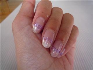 ネイルサロンに行ってきました。今回は今までのスクエアカットからラウンドカットに変えました。短めの爪だと、こちらの方が可愛らしい感じになる・・、とのアドバイスをいただいたため。 ホワイトグラデーションにパープルのシェル このデザインはシンデレラ☆ネイルさんのものをまねっこしました。素敵なデザインを紹介されてて、毎回楽しみに見てます。パープルは大好きな色なので、パープル特集でこのデザインがあったときに、参考にさせてくださいとお願いして、念願かなったものです(^0^)♪ シンデレラネイルさん、ありがとうございました!