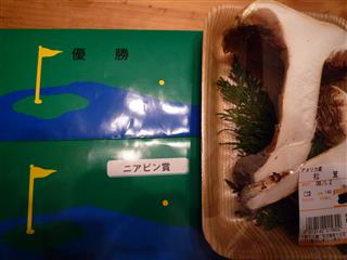 昨日は、仕事関係のゴルフコンペがありました。 東建多度カントリー、綺麗なコースです。 そこで見事優勝しました! といっても、6人のコンペですので自慢は出来ませんが・・・。 松茸は、参加賞。 ニアピンも一つ、ゲットしました。 ただスコアは満足できるものではなく、ダブルペリアで救われたって感じですが・・・。 まだアプローチイプスは克服できていませんが、とりあえずは結果オーライですね。