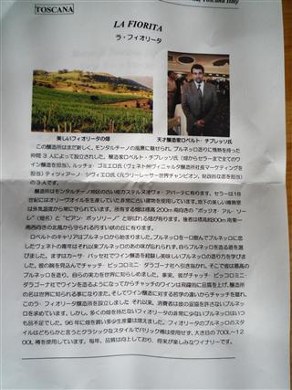 土曜日、そう狂言の次の日、二日酔いの身体に鞭を打ちつつワイン会に出かけました。 monzaburo-がこよなく愛するブルネッロの造り手のラ・フィオリータの会が、新装オープンしたてのトラットリア・ケイヤで開かれるとの事なので行かないわけがない。 出されたワインは2種類のみで、ロッソ・ディ・トスカーナIGT「ラウルス」2006サンジョヴェーゼ70%メルロー30%バランスの取れた非常に飲みやすいワインでした。 ブルネッロ・ディ・モンタルチーノ2003そしてもう1本は今回の目玉、ブルネッロ。 ただ2003年なのでまだまだ若いので、4時間ほどデキャンンタージュされて提供されました。爆発的な果実味、土の香り、厚みのあるタンニンにエレガントな酸味。まだ若いのですが、充分美味しい!ますますブルネッロが好きになってしまいました。 さて出された料理は自家製パン 前菜盛り合わせ生ハムと無花果 インカのめざめとシャンピニヨンのスープ鴨のテリーヌ ばちまぐろの燻製 牛蒡とパンチェッタのトマトソ-スパスタ 牛蒡のシャキシャキ感が、おもしろかった。 メイン カタラーナ ラ・フィオリータから来日された方の説明を聞きながらの、楽しい会でした。 トラットリア・ケイヤ東区東桜1-6-3 ユニーブル栄2F奥052-973-1230
