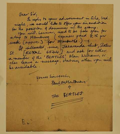 ビートルズの初のハンブルグ遠征の前、固定のメンバーはジョン、ポール、ジョージとスチュアート・サトクリフの4人だった。この時点では臨時のドラマーしかいなかった。1960年8月6日、土曜日に定期出演していたグローブナー・ボールルームの仕事は地元住民の苦情でキャンセルとなったため暇になり、彼らはモナ・ベストが経営するカスバ・コーヒー・クラブに出かけた。そこで解散寸前のブラックジャックスのピート・ベストがドラムを叩くのを見た。ビートルズはピートにハンブルグ遠征の話を持ち掛け、金曜日にオーディションを受ける同意を得た。そして、金曜日の8月12日になったわけですが、同じ日にポールは8月8日にリヴァプール・エコー紙の求人広告欄に載っていた「ドラマー、若い、ひま」とメッセージを載せた匿名のドラマーに返信していました。内容は水曜の夜にビートルズのドラマーのオーディションをするという提案でした。それが書かれていた手紙は、2011年に発見された。マージーサイドのブ―トルで開かれたフリーマーケットでコレクターが50ペンスで買った本に挟まっていたのだ。最終的には2011年11月15日のクリスティーズオークションで34,850ポンド(55,000ドル)の値が付いた。https://gejirin.com/beatles/history/1960/19600812_letter_drummer_audition.htmlhttps://gejirin.com/beatles/history/1960/19600806_ask_petebest_join.html
