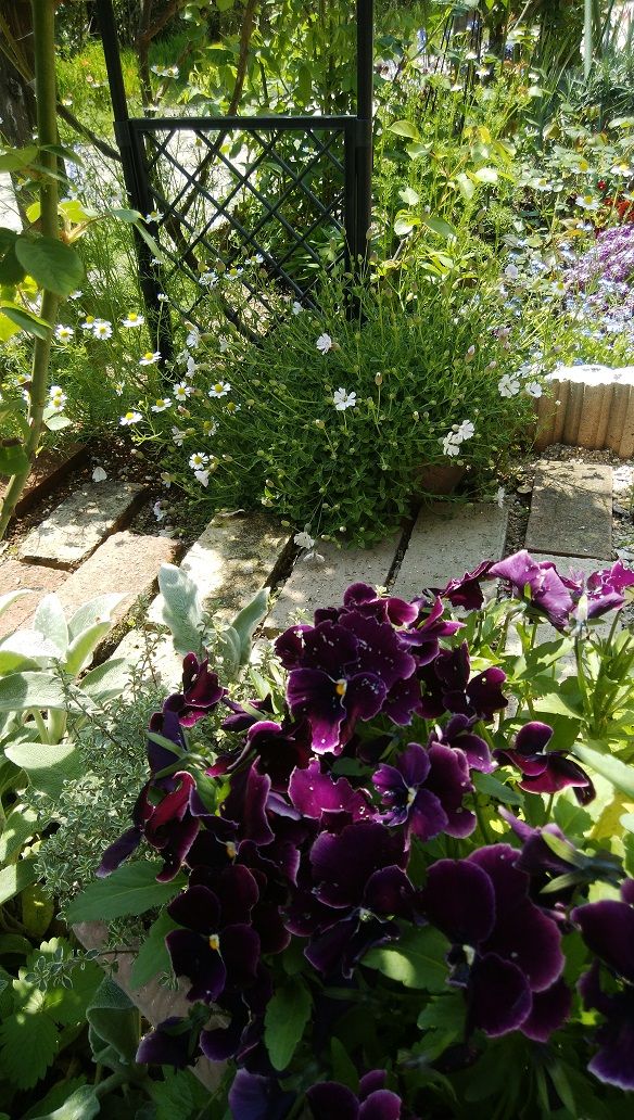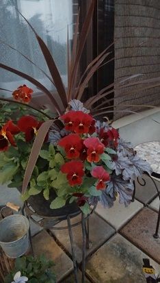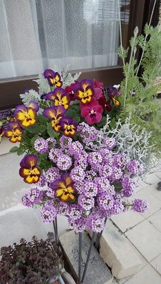 先日植えこんだパンジー・ビオラがにぎやかです大人っぽいです同色系のパンジー・ビオラを寄せ植えです「とってもかわいいなぁ」と癒されております