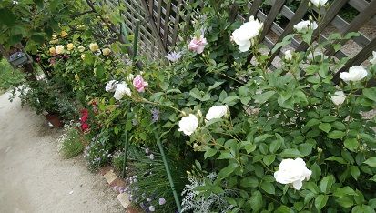 賑やかになりましたバロン・ジ・ロード・ラン今年は調子よいですクロードモネです花弁がしっかりしていて雨にも強いようです白いバラはアイスバーグ花付きよく香りもとてもグッドです~