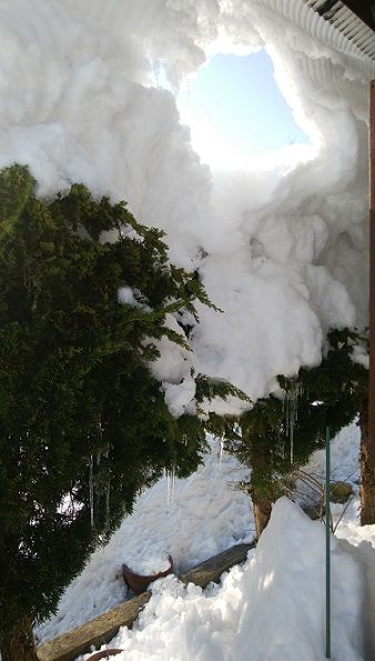 やっと寒波が去りました屋根からの雪ずりが植木に落ちて、あらあら~つららも下がって・・・・温暖化で近年こんなことはなかったのですがねぇ