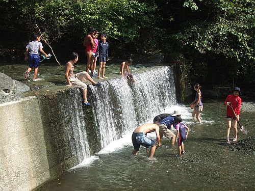 「冒険クラブのお泊まり at ペガススの家」から帰ってきました。土曜日は、滝ジャンプに最高の暑さで、みんなボンボン飛んでいました。でも、最初着いた時にアレッと思ったのは、先日の台風で土砂が流れ滝壺が埋まってしまい浅くなってしまっていたことです。これではつまんないし、危ないということで、急遽みんなでシャベルで穴を掘りました。以下はその写真です。それで、本番開始。みんな嬉しそうに飛びます。セーノ、で飛び出そうとするのですが、なかなか息が合いません。滝で修行(?)もしました。すごいでしょ。思わず拝みたくなるでしょ。石やジャリを動かして、川に新しい流れを作りました。火もありました。火遊びもいっぱいやりました。そして、いっぱい食べました。水も、火も、土も、食も、いっぱいある二日間で、みんな心もからだも満腹でした。ペガススの家、ありがとう。