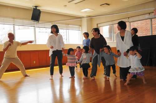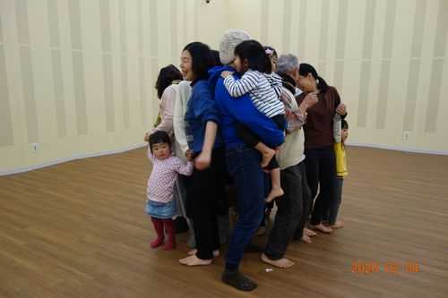 「生まれる」と呼んでいる遊びで、お母さん達が卵の殻で、中に子どもたちがいます。子どもたちが外に出ようとするのをお母さん達が邪魔しています。