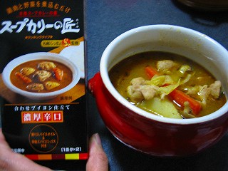 近所の試食コーナーで、スープカレーを配っていました。食べたかったのですが、時間が無かったので通過。「冷蔵庫の残り野菜 どれを入れてもいいですよー」ふむふむ。さっそく、翌日チャレンジしてみました。裏側を見ると、チキンカレーと野菜カレーが。で、野菜には白ねぎを入れてもいいとか。まじですか??そこで、家にあるもの・・・にんじん じゃがいも 白ねぎ キャベツ そして鳥モモ肉。切っていためて煮て・・・ で、このようなものが完成。ルーがおいしかったみたいで、すごくおいしかったですよ。そして、簡単。おススメです♪