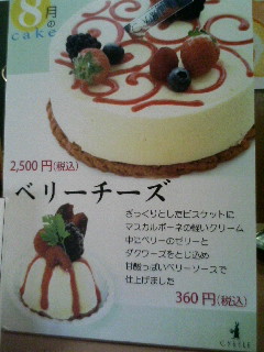 の続きです…お土産用にラスクを買いに行きました…が いつも気になるケーキ!欲しいo(^o^)oっと 今回初購入♪8月のケーキ?ベリーチーズ です!見た目もかわいい(-.-)y-~~~のですが ベリー好きなちっぷは 味も楽しみ!だったのですが…なんと 箱のなかで たおしちゃいました(ToT)くずれてもおいしかった!くずれるまえのを 撮りたかったな~