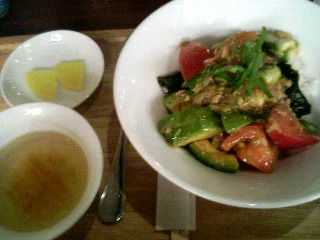 ご飯にのりをしき 上にアボカド、トマトをのせて ツナと玉葱を和えたしょうゆ味のソースをかけた感じです!