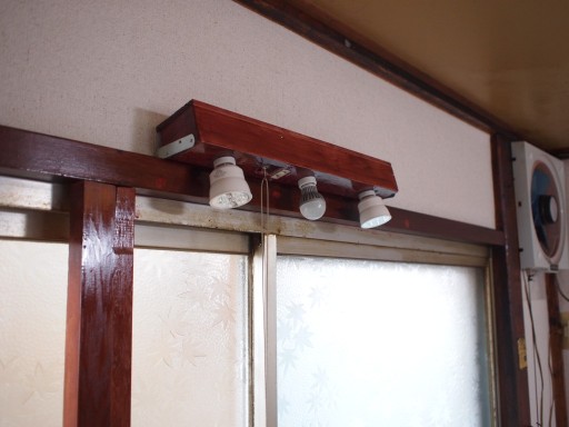 安アパートに引っ越した。 キッチンだけは壁紙を張り替え終わったので、蛍光灯をLED化してみた。蛍光灯がボロボロで油でドロドロ..壁紙を白にしたら余計に汚れが目立って仕方がないからLED灯をつくてみたのだよ。蛍光灯を買ってくるんじゃ芸がないからね。LED球はそんなに発熱しないから枠は木で十分だ。他の工作で余った木を使用して枠を作成した。 回路図はこんな感じ。 木枠の中はこう。 接続には脱着が容易にできるようにと、それからショートしないようにという目的で、車用パーツのギボシ端子を使用した。☆皆様のおかげで無事店舗再開です!!ありがとうございます☆エーモン 1152 ギボシ端子セット 配線コードの確実な接続に! 【端子】 【送料サイズDD】 100Vのコンセントは、ばらした蛍光灯から外して移植 手前と奥の白い丸いものがLEDとか電球を付けるレセップ。今回は2種類使用してみた。 両サイドのちょっと大きめのものELPA 丸型レセップ SB-1715H中央のもの ELPA 丸型レセップ SB-1713H(W)ドリルで穴をあけて円筒部を通し、ビス固定する。この際の穴サイズはSB-1715がφ26で間口が小さいからヤスリ加工が必要だった。SB-1713はφ26で丁度良かった。ドリルはこんな形状のもの 【LENOX】【木工用ドリルビット】レノックス バイメタル シップオーガービット 【ショート/26mm】 [07A1716]ホームセンターなどで1,500円程度で購入できるもので十分だろう。 ひものスイッチ(キャノピースイッチという物らしい)は仕切り板に止め、ヒモが出る部分の木を彫って位置調整。WS5201HP 【パナソニック電工】 キャノピスイッチ/P写真はスイッチのカバーを外した結線状態です。 表面は耐油性(キッチンなので)を考慮し、油性ニスで仕上げました。