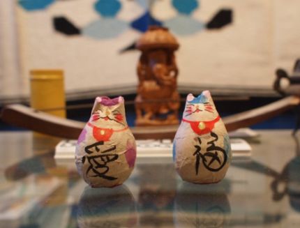 昨年の9月、実家に帰省する際に小さい「招き猫」を2つ買っていった。実家ではお袋が習字教室を開いているのでお袋にプレゼントした。そしたら間もなく、お袋が「あんたさあ、猫買ってきてくれたじゃん。」「あの猫、玄関にかざっておいたんだけどね」「そしたら新しい生徒さんが2人きたのよ」という。それが、下の猫ちゃんずだ。この猫たちが客を招いてくれたんだね、きっと!今回はプレゼント用として、サーフショップに2つと母に2つを購入しました。ネットでは売ってない。伊豆は修善寺、温泉街のど真ん中の店で購入しました。他で作る人にお願いして製作している手作り品ということでした。さてさて、今回はご利益ありますでしょうか。ありますように。.