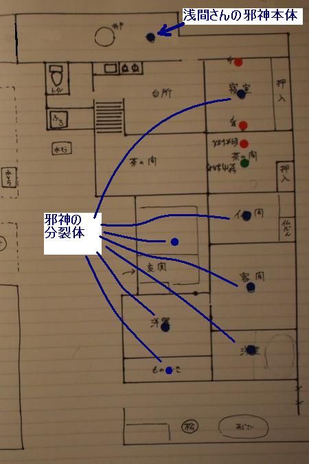 今日は富士市在住の霊媒師Yさん宅へ行ってきました。そうです、家・土地の霊症を検証するためです。昨日の前置きはこちら → 病を生む土地の改善を検討する(2)心房中隔欠損症を書いた記事はこちら → 心臓病を生む家そこのYさん宅へ行く時はいつも家の図面を持って行きます。きっとそこで見てもらった方も数百人はいるでしょう。そして、これが結果です。持っていくと、遠隔霊視してくれて何が何処にいるかを調べてくれます。●結果としては写真の上の方が小屋になっており、そこに悪魔化した(邪神化した)神がいるという事でした。その神さまは浅間神社で祭っている神だというところまで解りましたが、神の名までは今回は解りませんでした。多分、400年前位に人々がそこに祠(ほこら)を作ってお祭りしていたんだろう。時代の流れとともに祠は無くなったけど、神の魂は存在していて人が拝まなくなったために邪神化したんだよ。という事でした。「いいんだよ、こんなもん。潰してしまえばいいんだから。」そういって、ものの数秒で抹消して下さいました。「浅間さんってのは増殖するからね。他の部屋にもいるだろ!」「これもね、潰せばいいの」そう言って、次々に各部屋に増殖した紺のシール(邪神)の所を抹消。「浅間さんが邪神化すると病」「お稲荷さんが邪神化すると突然死」「○○さんが邪神化すると...」「全部、決まってんのよ」私「はぁ、そんなもんですか?」こんな感じの非日常的な会話が続く。なんか、どこぞのRPGでもしてる気分になる。「でも茶の間周辺にゃ、いねぇえなや、何かおるんか?」「どれ、親父さんとお袋さんの名前きゃ~てみ」(注:書いてみなさい)そういってペンジュラム片手に色々と調べはじめるYさん。私のペンジュラムとは形が全然違うし反応速度が私の数十倍は早い。「ここにすわってるの、だれ?」そう言って、茶の間の真ん中付近を指差す。私「親父です。」「あぁ~わかった、親父さんに関東の笠間稲荷の神さんがついてるよ」と言って、緑のシールを茶の間中央にペタリ。私「え、でも親父は心臓悪くって心肥大にもなったし、ペースメーカーも入れたし「神さまが付いてるのに、どうしてなんですか?」「だって、拝んでないでしょ」「だぁから、神様が怒ってんの」「笠間稲荷の神が怒ってて、心臓に憑いてんの」「だぁから、心臓が悪くなんのよ」「大丈夫だ、まだ邪神化してにゃぁから、拝めば、直る、そんなもん」私「はぁ、拝めば直りますか?」「あぁ、直る!直る。」「親父さんに憑いてた稲荷さんに、白蛇がついてんの」緑のシールの隣にオレンジのシールをペタリ。「この白蛇ってのが、ものすんげぇつえ~の」「だぁから、親父さんが普段いる場所の近くに、邪神が寄ってこれねぇの」私「あぁ、なるほど、それで茶の間周辺には邪神がいなかったんですね」「あれ、お袋さんも波動高ぇなや」私「あ、前回みてもらった時には、菩薩さんがついてるって」「あぁ、そうだね。菩薩さんだね。」「あれ、でも2人いるみたゃぁだで」(注:2人いるみたいだよ)私「え、一人だと思うんですけど」「いやぁ、2人おる、男と女の夫婦でおる」「だぁから、お袋さんは波動高ぇんだなや」私「って事は、ここの土地には邪神がいるんだけどお袋は菩薩さん2人に守られてるから、そんなに障害がないんでしょうかね?」「ん~、かもしんないね」こんなやり取りでした。----------------- まとめ -------------------------実家の小屋に邪神化した神がいた。どうもその神が災い(病)の原因のようだ。もちろん、これで陰の気が無くなったかは現段階では解らないが帰ってから写真を撮って、八王子の気功師に見てもらえばどう変わったかが判明する。もし陽転していたり、陰のレベルが小さくなっていたら霊的に邪なものは陰陽の気功的に見ると陰に見えるという事になる。そして私も住めるようになる可能性が大で、めでたし。気功的に改善されていなければ全く別物で、依然として私が住める所ではない可能性が残る。さてさて、どうなるものやら、お楽しみだ。 結果はこちら → 「病を生む土地の改善を検討する(2)結果」---------------- 今日聞いた参考メモ -------------------浄霊:悪い霊を鎮める行為。但し3日~10日で元に戻る。 私も他の方にして頂いた経験があるが、その位でまた調子が悪くなった。除霊:悪い霊を消滅させる行為。 夢で女神?に水子を抜いて貰ったが、あれは除霊っぽい。 私の体験談はこちら → 「僕が迷い込んだ宮殿」Yさんが、電話越しに浄霊して下さいと言われる事があるらしいが、除霊はするけど浄霊はしないと大体は断るらしい。遠隔で除霊する際に必要な能力: 遠隔霊視力:Yさんは3月までは天津太魂主命の白狐を使っているとのこと。 私もたまに霊に首を絞められるのを見れた経験を説明したら 私に憑いている聖観音菩薩さまの使いの白狐の力だという。 遠隔除霊力:Yさんは3月まではイザナギの命の白蛇を使っているとのこと。 残念ながら私にはこの力がな