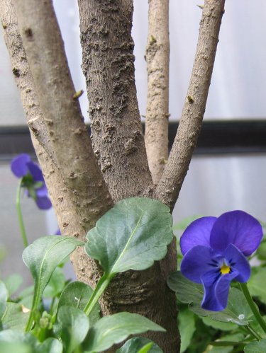 去年植えたキンモクセイ。狭いベランダで、夫が大事に育てている。久しぶりに写真を撮ってよく見たら、幹から新芽がのぞいていた。こんな低い位置の芽は たぶん 取ってしまうべきものなんだろう。でも、しばらくの間そのままにして やわらかな若葉を楽しもう♪< キンモクセイの幹とビオラ >