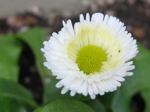 暮れに植えたデージーが咲き始めた。でも、期待していた花とはちょっと違っているような気がする…確かポンポンダリアのようにまん丸くなって咲く品種を買ったはず。とってあった札を見ると「ポンポンネット」と書いてあってこんもりと半球状になった花の写真が載っている。う~ん、なぜ???まだ寒いから?暖かくなったら花びらの数も増えるのかな?< デージー >