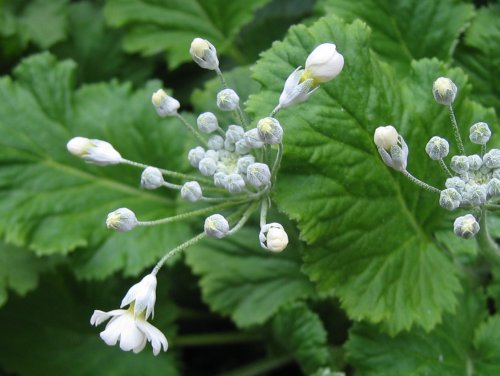 いつ咲くのか、ワクワクしながら待っていたプリムラマラコイデス。先に花芽が上がってきたピンクが きっと一番だろうと思っていた。それなのに、真っ先に咲いたのは白。クリーム色のつぼみが ふくらむにつれて白くなり、ふんわりと開いている。花も子どもも、同じだ~予想通りにはいかないなぁ…< プリムラマラコイデス >